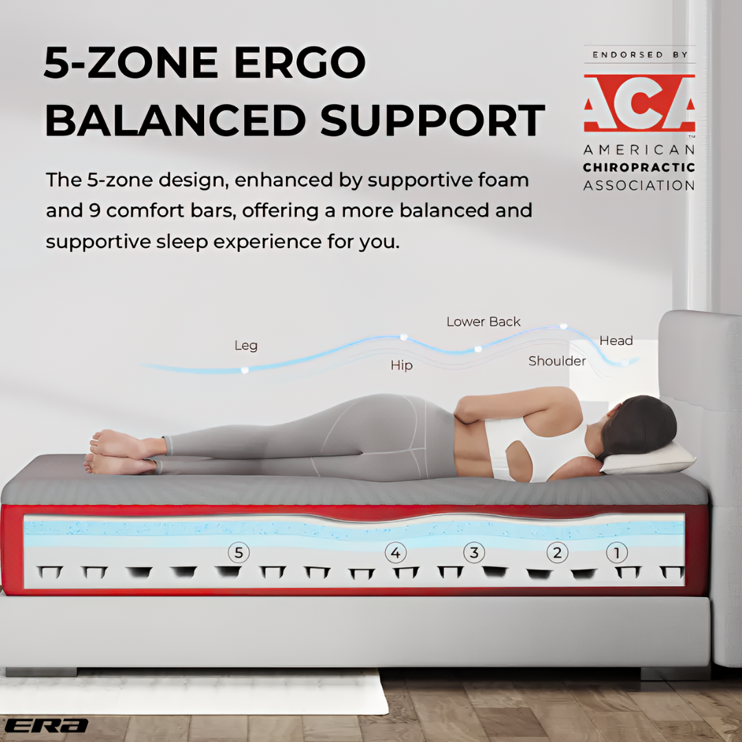 The ERA DreamCool™ offers a modern, low-profile design that fits standard bed frames. It provides spacious, even support without bulk — ideal for both personal and shared spaces.