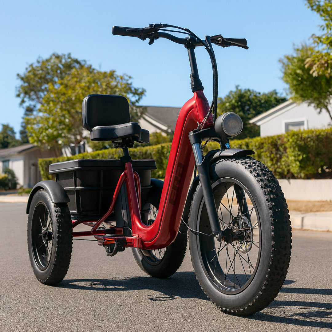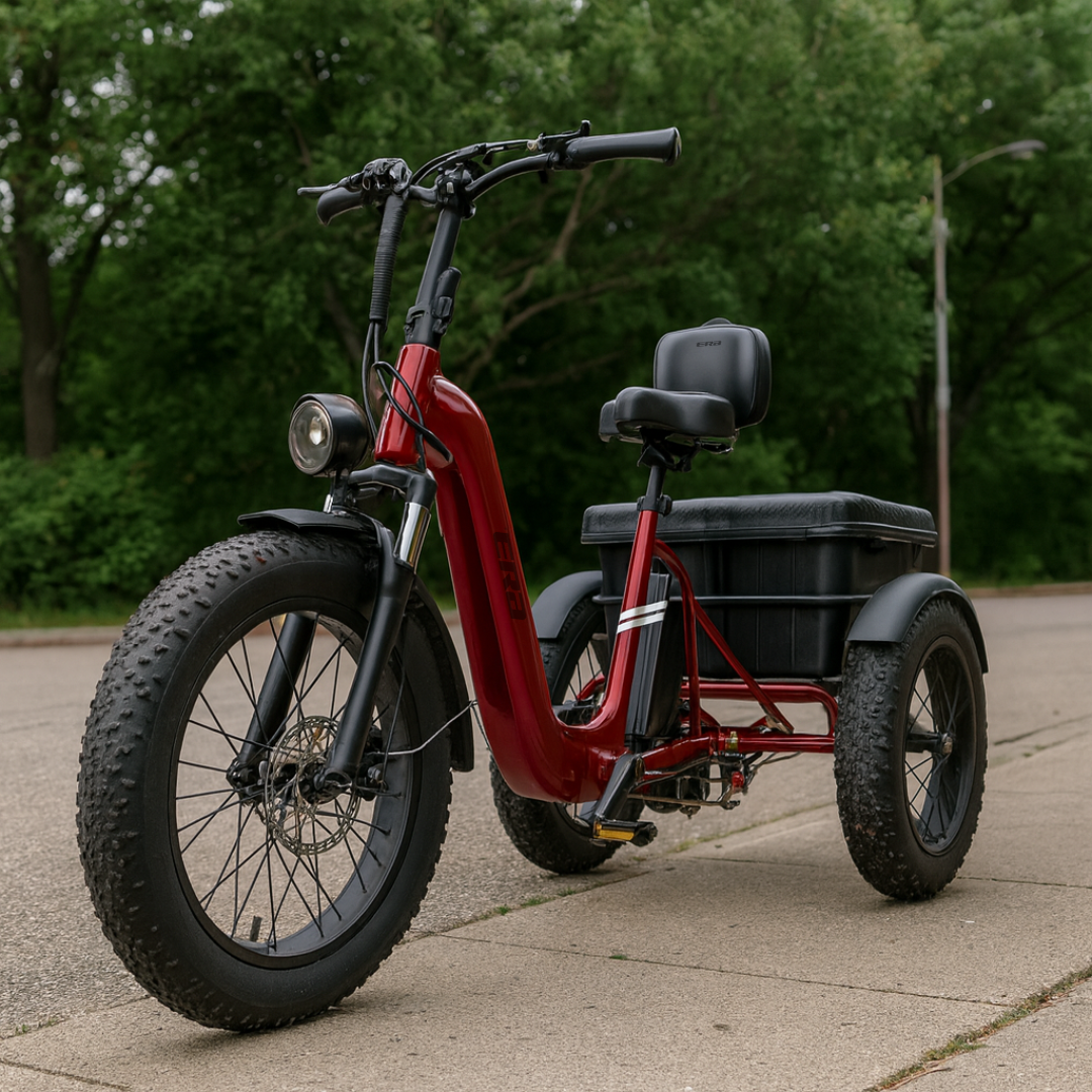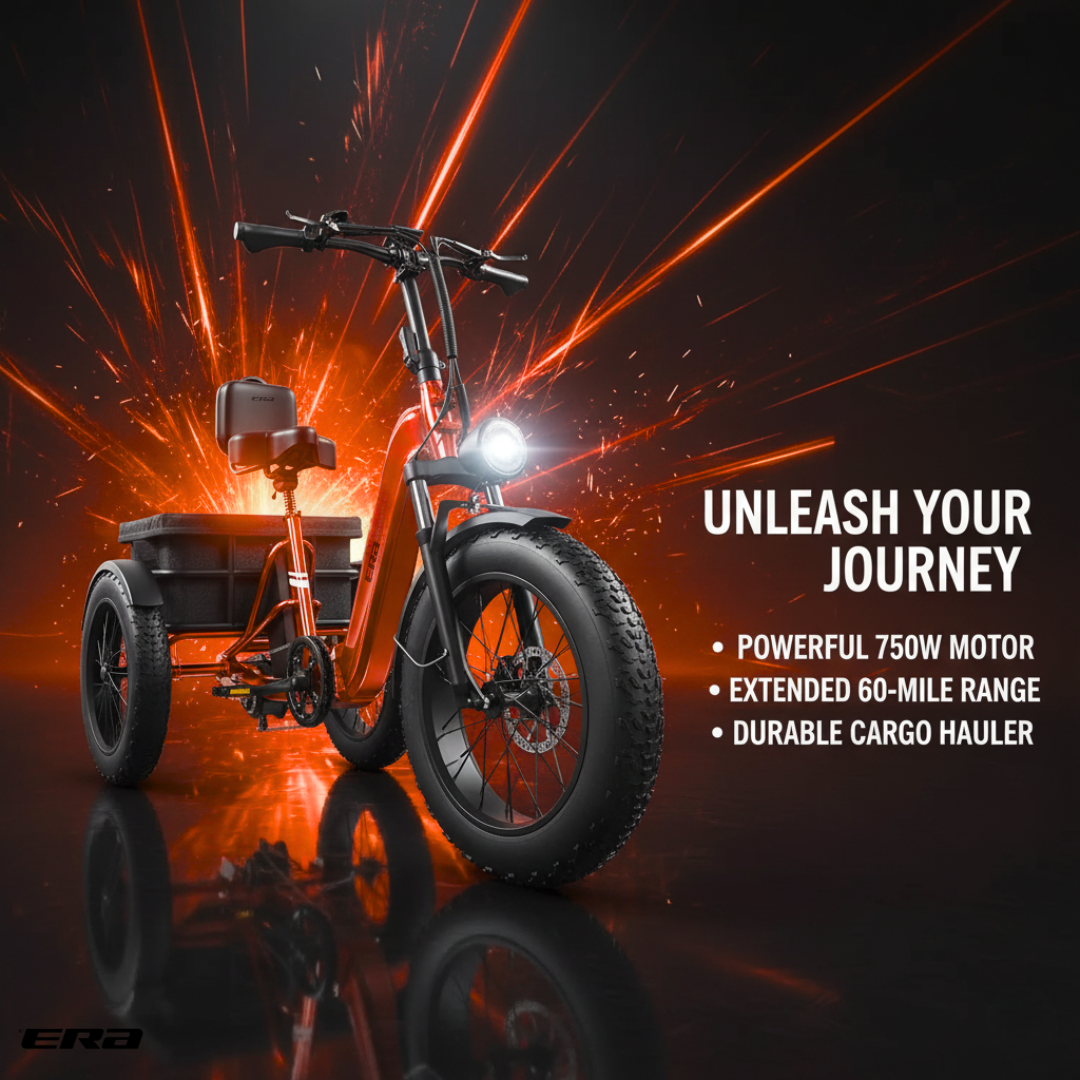 The ERA TriVolt™ is a heavy-duty electric trike with a 750W motor, 60-mile range, and 500 lbs load capacity — built for stability, power, and all-day performance.